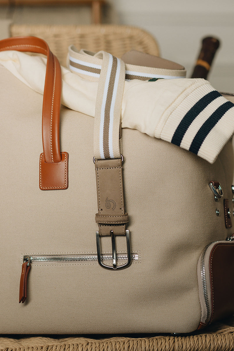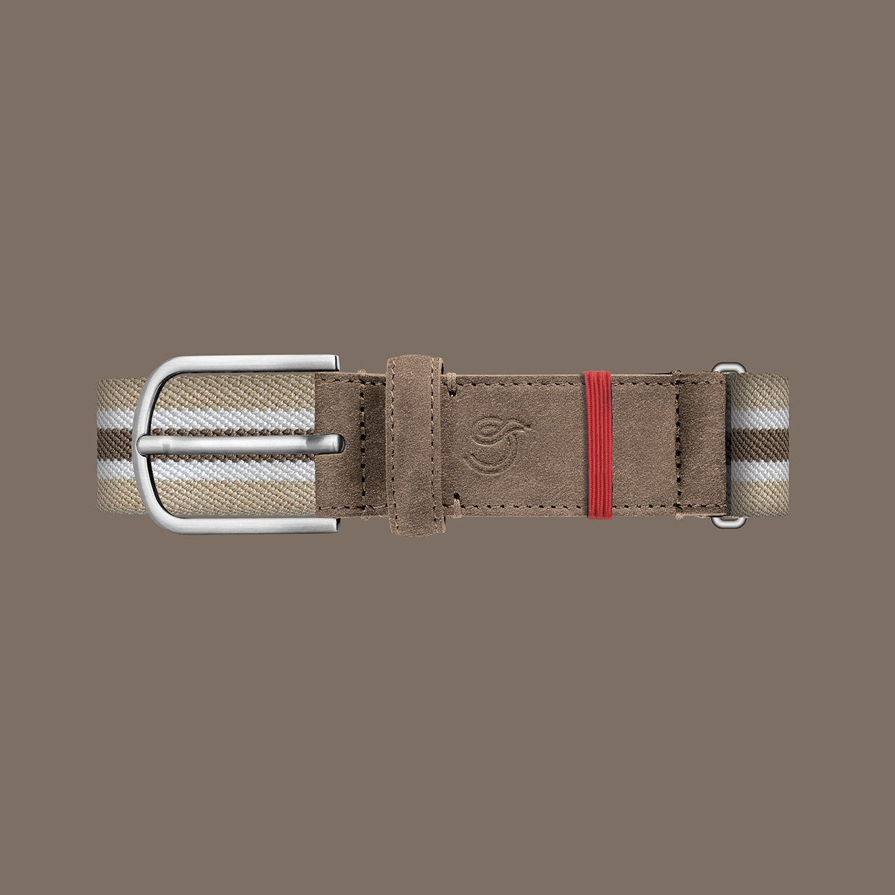 The Cornell Belt, woven in beige. A hybrid smart belt that combines suede leather with an adjustable clasp for a perfect fit. Classic from the front, sporty-chic from behind.
