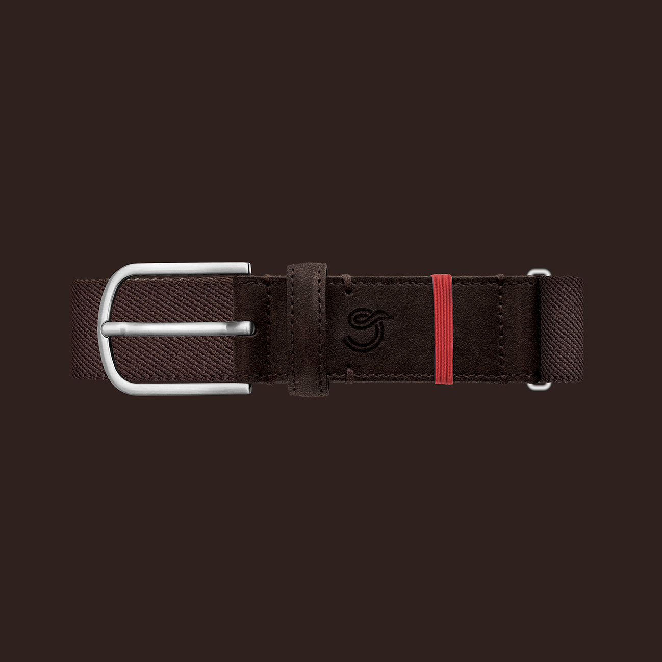 The Marina Bay, woven in dark grey. A hybrid smart belt that combines suede leather with an adjustable clasp for a perfect fit. Classic from the front, sporty-chic from behind.