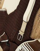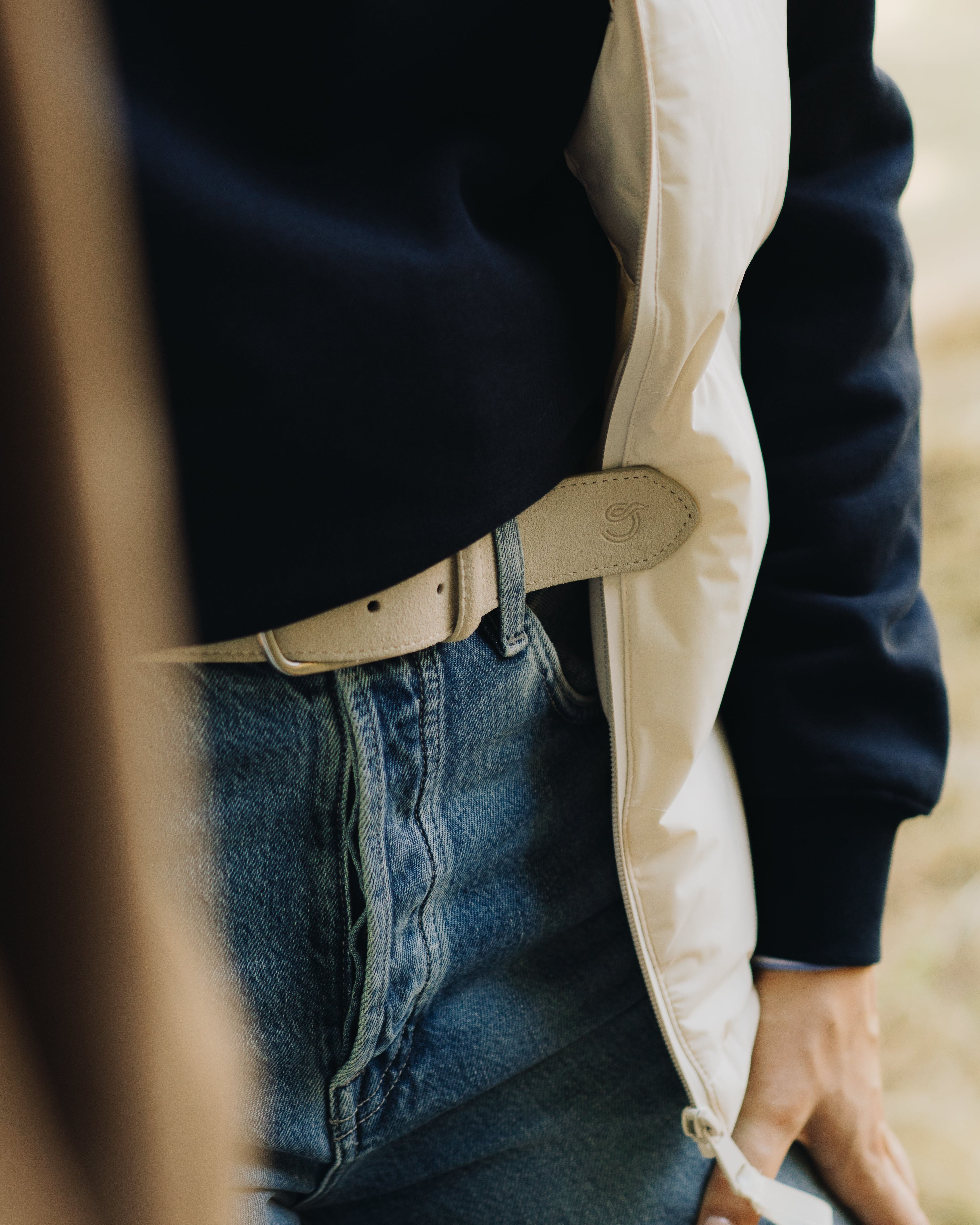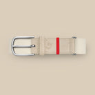The Monaco Belt, woven in cream. A hybrid smart belt that combines suede leather with an adjustable clasp for the perfect fit. Classic from the front, sporty-chic from behind.