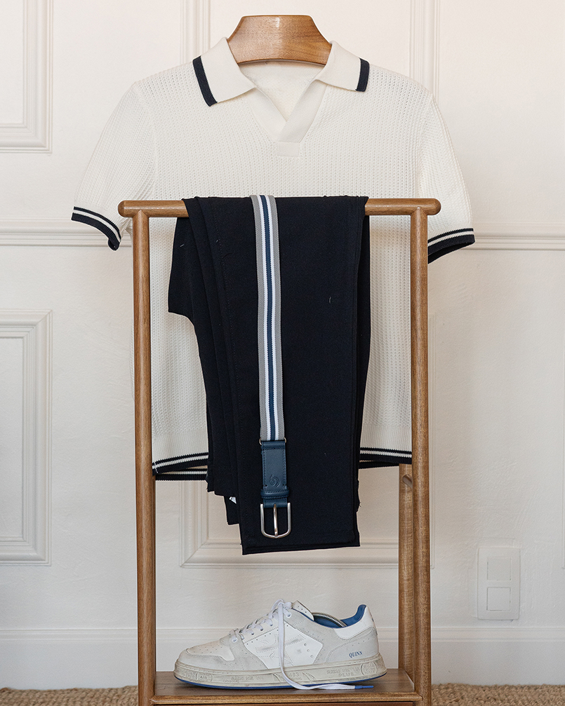 The duke Belt, woven in grey, blue and white. A hybrid smart club belt that combines suede leather with an adjustable clasp for a perfect fit. Classic from the front, sporty-chic from behind.