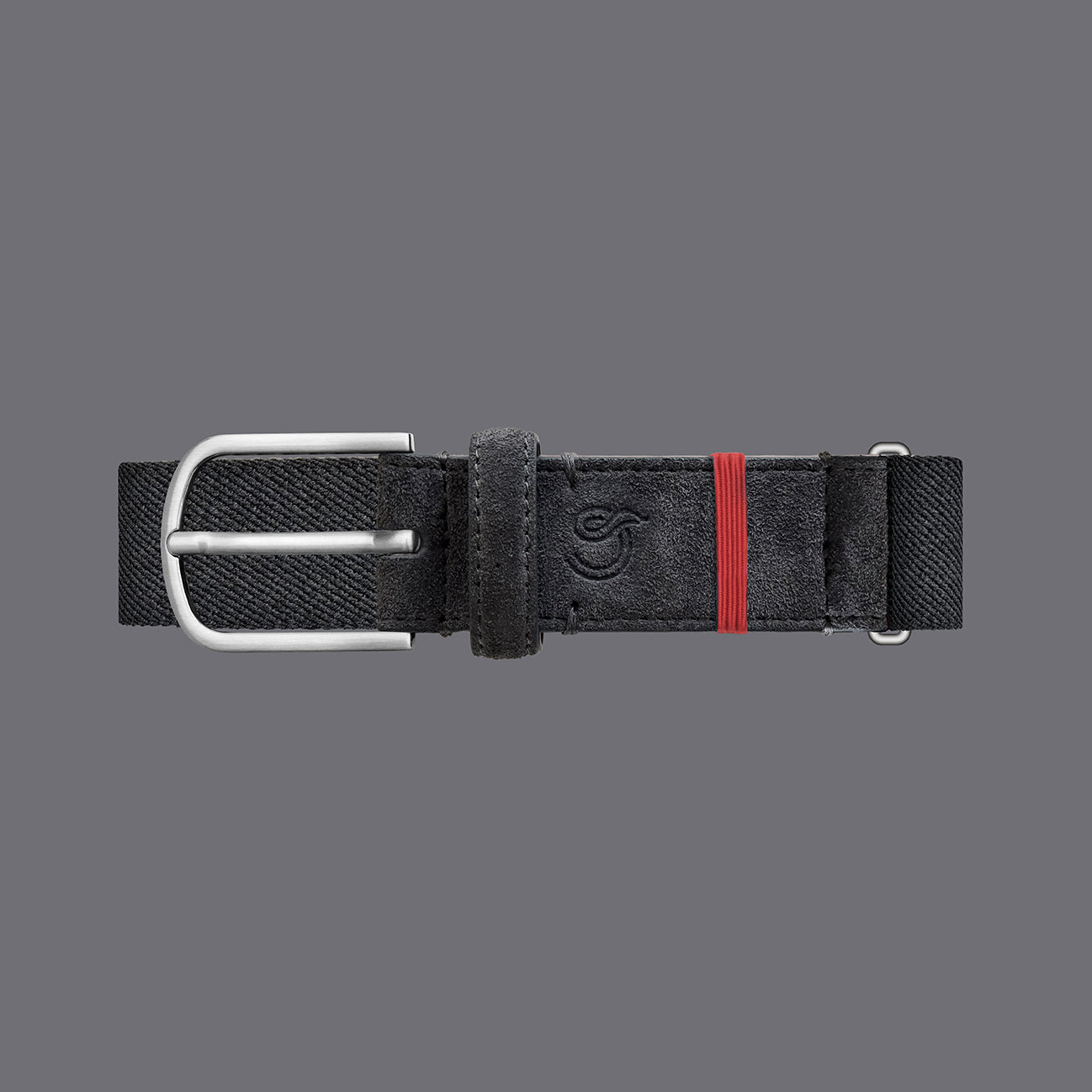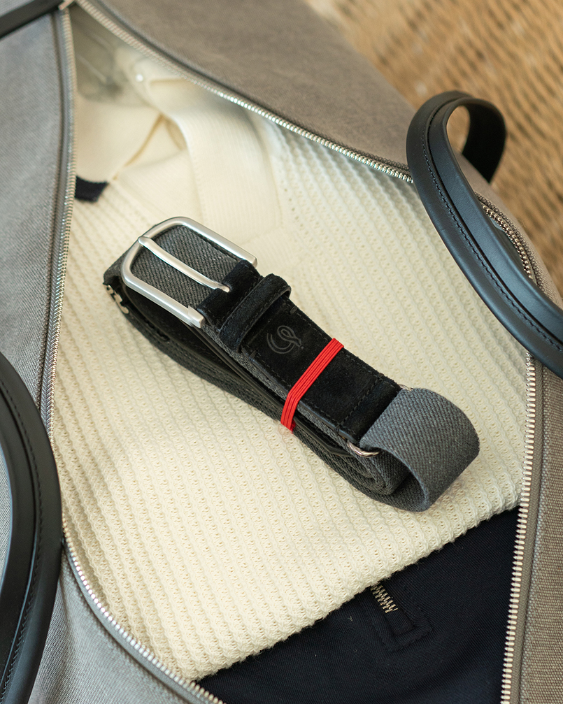 The Porto Cervo Belt, woven in dark grey. A hybrid smart belt that combines suede leather with an adjustable clasp for a perfect fit. Classic from the front, sporty-chic from behind.
