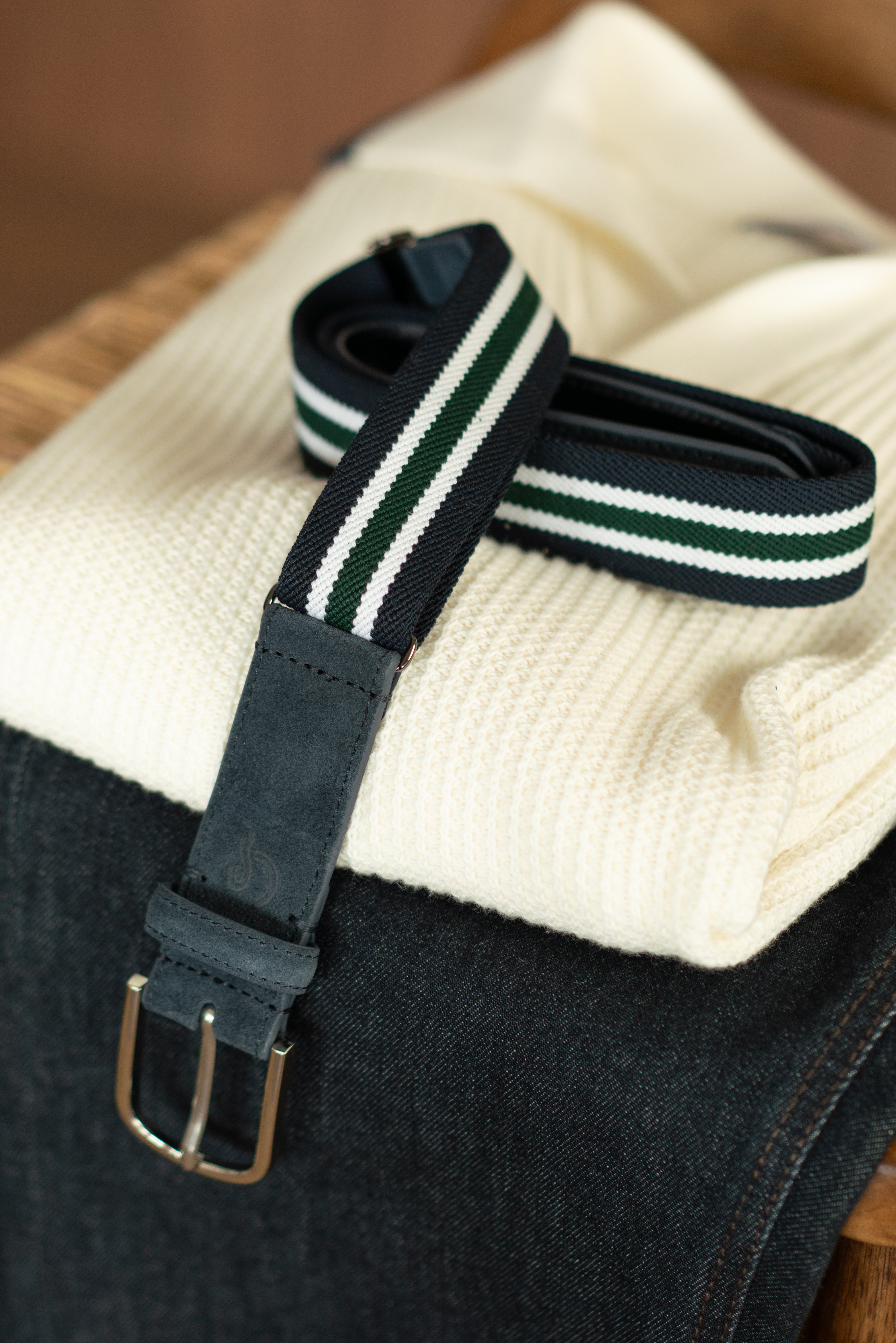 The Princeton Belt, woven in Dark Blue, Green & White.A hybrid smart belt that combines suede leather with an adjustable clasp for a perfect fit. Classic from the front, sporty-chic from behind.