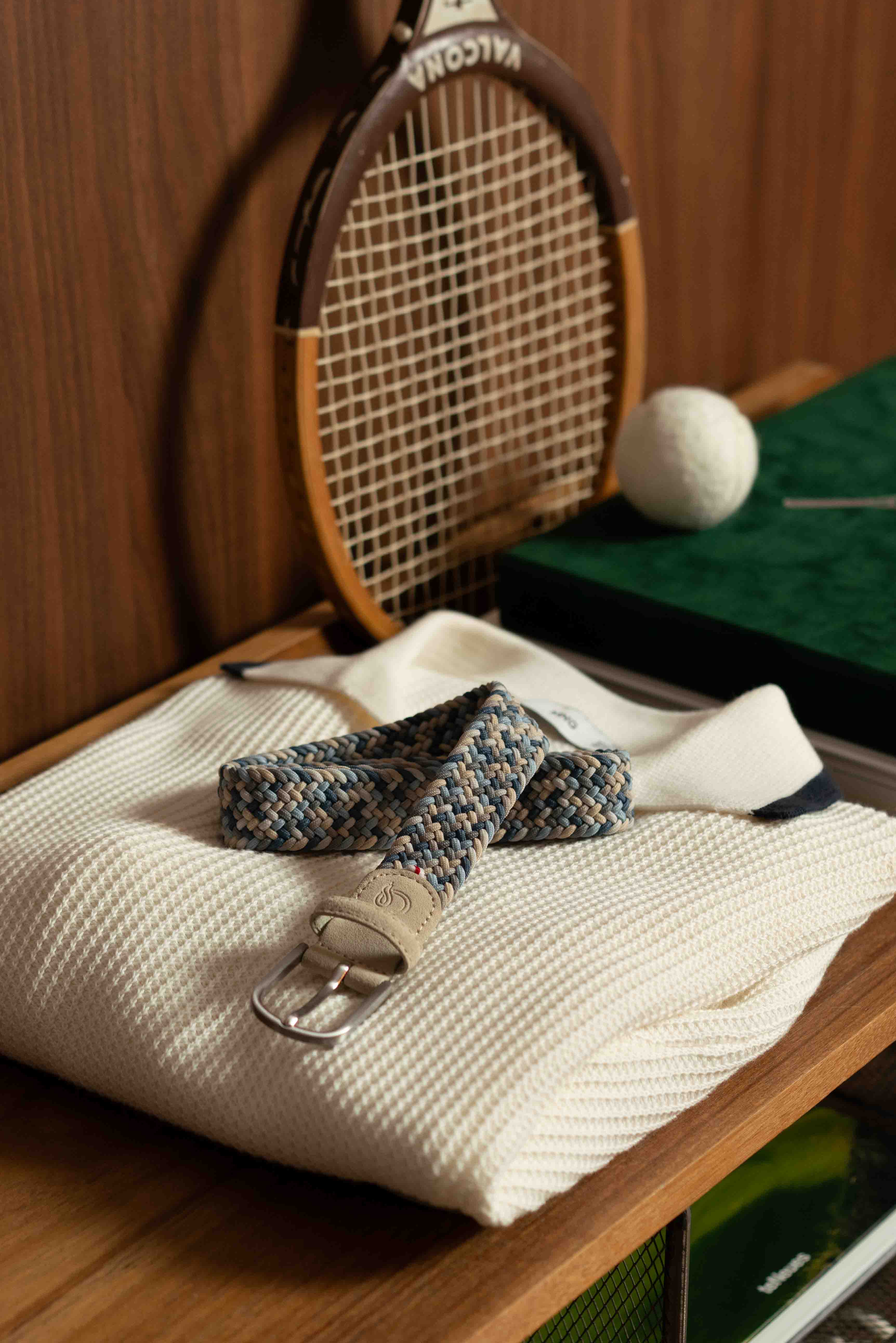 The Santa Barbara belt, crafted from suede leather and braided in a mix of blue/beige.